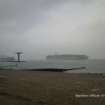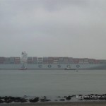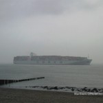 Het tweede opvallende schip was de Cosco Oceania. Er was al even een deel van een brug van een schip te zien achter de dijk, maar door de regen was moeilijk te zien van wat voor soort schip het precies was, en waar het naartoe ging. Opnieuw dachten we dat dit schip de CSCL Star zou zijn, maar de romp van het schip, dat naarmate het schip dichterbij kwam, steeds grijzer werd, ontkrachtte deze gedachte. Na een tijdje werd zichtbaar dat de Maersk Penang aan de kant ging voor de Cosco Oceania; vandaar dat de Maersk zo’n rare koers en vaart aanhield, namelijk heel dicht langs de wal en erg langzaam. De Cosco Oceania was dus het eerste schip dat voorbij kwam. Er lagen al vier sleepbootjes te wachten om beide schepen te begeleiden naar hun ligplaatsen.