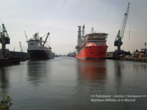 Vandaag heb ik samen met zes medestudenten een rondleiding gekregen op de Fairplayer van rederij Jumbo Shipping. De Fairplayer ligt al enige tijd in de Waalhaven in Rotterdam, doordat het schip klaar wordt gemaakt voor een offshore-project. Bij dit project is het de bedoeling dat enkele componenten in zee geplaatst gaan worden. Op dit moment worden hiervoor de benodigde installaties en systemen in het schip ingebouwd. Door deze werkzaamheden, vond de bemanning een gaatje in de planning om ons rond te leiden door het schip. Tijdens de barbecue afgelopen vrijdag konden we ons voor deze rondleiding opgeven. Vandaag verzamelden we ons in de hitte bij de ingang van de terminal.