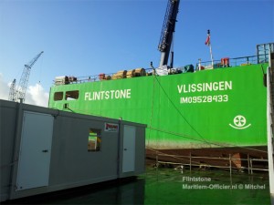 De Flintstone, een stenenstorter van 155 meter lang en 32 meter breed. Een nieuw schip dat onlangs vanuit Shanghai naar Nederland is komen varen.