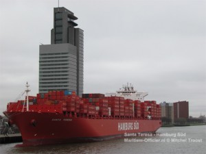 Vandaag is het 300 meter lange containerschip de Santa Teresa van rederij Hamburg Süd gedoopt in Rotterdam. Het schip lag aangemeerd aan de Wilhelminakade bij de cruiseterminal, waar normaal ook de cruiseschepen van bijvoorbeeld de Holland America Line liggen. De plechtigheid vond plaats rond 11:00 uur vanochtend. Het containerschip werd hier in Rotterdam gedoopt, omdat dit de belangrijkste Europese haven is tijdens haar dienst tussen voornamelijk Europa en Zuid-Amerika.