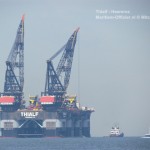 Na bijna twee maanden heb ik een geschikte dag gevonden om weer schepen te gaan spotten: de dag na Hemelvaart was lesvrij. Het leek ook nog eens aardig weer te worden, dus dat was helemaal mooi meegenomen. Bij aankomst op de pier, rond 11:15 uur, was er meteen al iets moois te zien: de Thialf van Heerema was op weg naar zee. Dit half-afzinkbare kraanschip was helaas al het begin van de pier gepasseerd, maar met mijn camera kon ik het gevaarte gelukkig toch nog wat dichterbij halen.