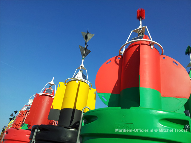 Eerst namen we een kijkje bij afdeling vaarwegmarkering. We kregen uitleg over de tot stand brenging, plaatsing van en onderhoud aan boeien, bakens en lichten. We gingen bovendien door de oude werkplaats heen, waar eerder reparaties aan de betonning werden verricht. Daarna gingen we de ‘achtertuin’ in, waar tientallen boeien en tonnen staan opgesteld.