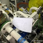 Een koelwatersysteem is van belang om verschillende onderdelen van een motor gekoeld te houden zodat het materiaal in de motor niet zwak wordt. Dit systeem is behoorlijk uitgebreid voor toch een relatief kleine motor (in de Zeevaart dan 😉 ). We begonnen met tekenen bij een centrifugaalpomp, het ‘hart’ van het systeem. Hierna was het gebukt door de halve machinekamer heen lopen om de leidingen te volgen en alle afsluiters sensors en aftakkingen in het systeem te tekenen. Uiteindelijk kom je bij verschillende onderdelen van de motor terecht en volg je de retourleiding weer richting de pomp. Deze tekenopdrachten zijn erg leuk om te doen, want het is eigenlijk een grote puzzel/speurtocht waar je je weg doorheen zoekt en als je het goed doet uiteindelijk weer bij het begin eindigt!